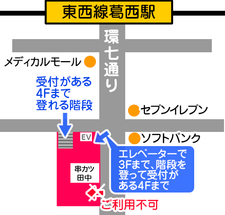 東西線葛西駅中央改札口を出て右側(メディカルモール側)に進みます。